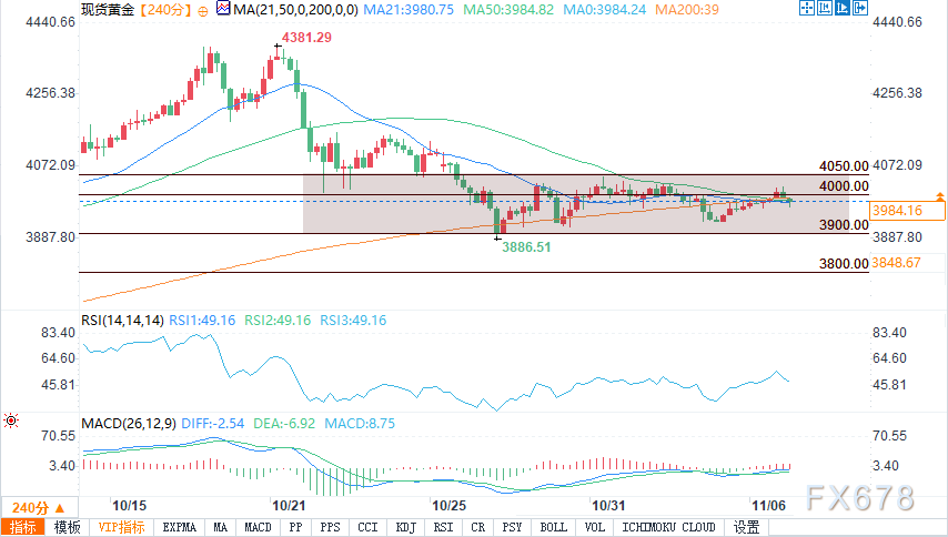 周四(11月6日)美盘时段,现货黄金在美元走弱的背景下短暂收复4000美元心理关口后小幅走低。金价盘中交投于3985美元左右,较日内高点4019美元有所回落,涨势陷入停滞。